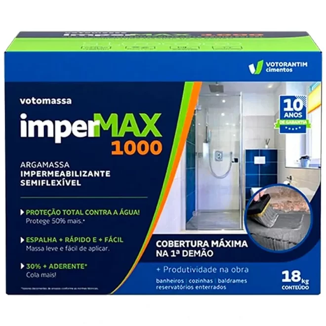 A Votomassa ImperMAX 1.000 é uma argamassa polimérica semiflexível impermeabilizante bicomponente (sendo componente A “líquido” + componente B “pó”), composta por cimento Portland, agregados minerais com granulometria controlada e aditivos químicos, que proporcionam um revestimento com propriedades impermeabilizantes.
