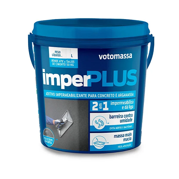 O ImperPlus é um aditivo impermeabilizante indicado para revestimentos de paredes e pisos em áreas internas ou externas, piscinas e reservatórios, baldrames, muros de arrimo, concreto impermeável e assentamento de alvenaria.